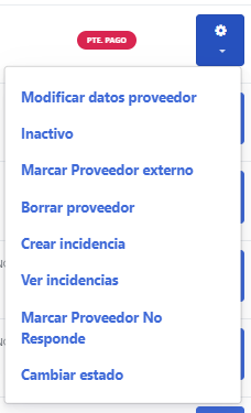 - Se podrán gestionar a través del botón azul (desplegable) situado a la derecha en el listado de proveedores.